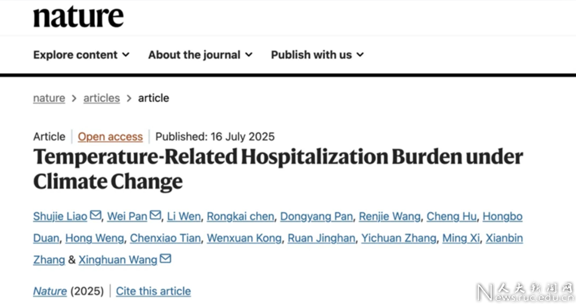 7月16日,中国人民大学应用经济学院潘伟教授研究团队和武汉大学、解放军总医院研究团队合作的研究成果Temperature-Related Hospitalization Burden under Climate Change,在国际学术期刊Nature(《自然》)以研究长文(Article)的形式在线优先发表。