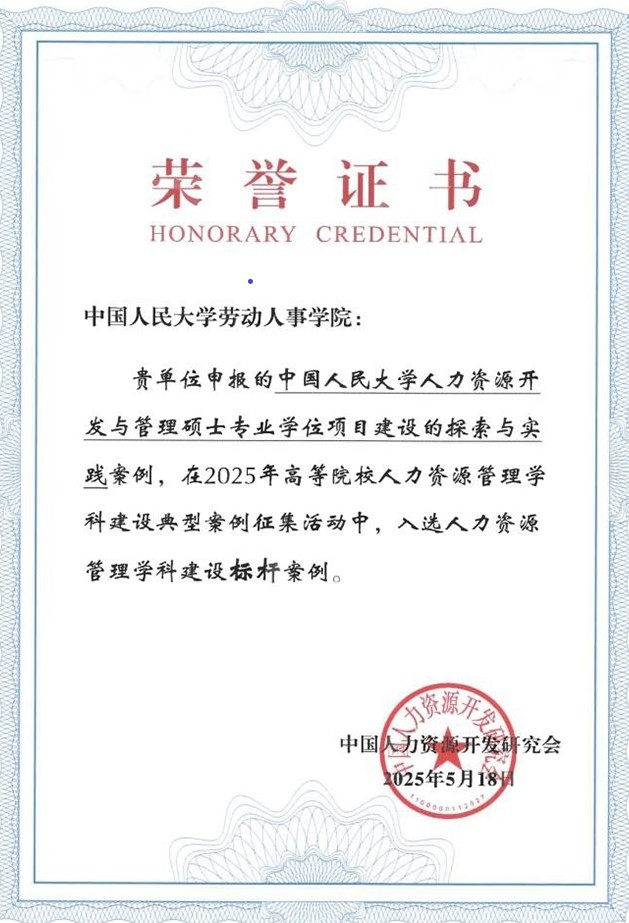 中国人民大学劳动人事学院申报的《中国人民大学人力资源开发与管理硕士专业学位项目建设的探索与实践》案例,在2025年高等院校人力资源管理学科建设典型案例征集活动中,入选人力资源管理学科建设标杆案例。中国人民大学吴玉章高级讲席教授、劳动人事学院教授、领导科学研究中心执行主任孙健敏受邀出席“第四届人力资源管理学科发展论坛”,进行主题报告并代表学院领取荣誉证书。