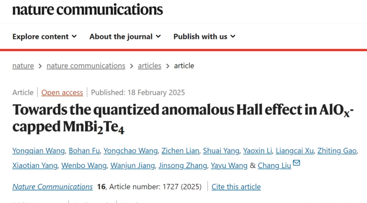 近日,由中国人民大学物理学院2024级博士研究生王永谦、付博涵共同作为第一作者,物理学院副教授刘畅为唯一通讯作者的论文“Towards the quantized anomalous Hall effect in AlOx-capped MnBi2Te4”发表在Nature Communications期刊。