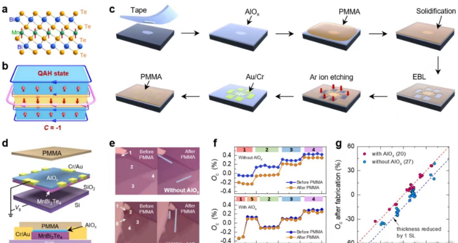 该研究创新性地提出利用沉积非晶氧化铝保护界面并提升磁各向异性的研究思路,成功开发出一种新型微纳加工方法,在多个器件中实现了量子反常霍尔效应。该工作中实现的可控构筑量子反常霍尔态的实验方案,不仅成功破解了过去五年国际上无法在MnBi2Te4体系重复量子反常霍尔效应研究瓶颈,同时为后续开展新奇量子物性的调控研究奠定了坚实基础。