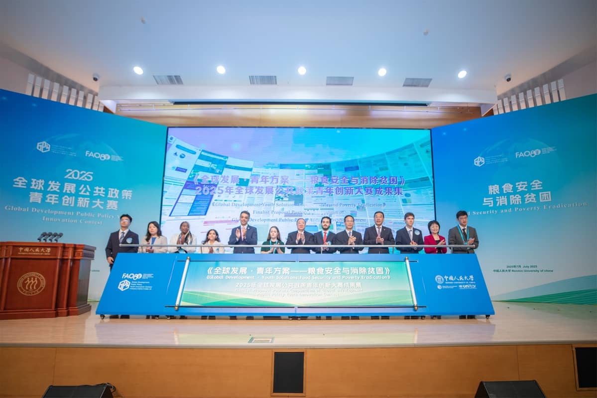刘焕鑫、徐晓、卡洛斯、张东刚、朱宝霞、联合国全球可持续发展目标与领导力发展中心执行主任高玲与来自六大洲的选手代表共同发布《全球发展·青年方案——粮食安全与消除贫困》赛事成果集。该成果集以高质量提案学术海报为基础编撰形成,以"更好生产""更好营养""更好环境""更好生活"四大行动方向为框架,精选收录了来自18个国家和地区的青年学生基于实地调研提出的30份政策创新建议,展现了青年破解全球发展难题的多元视角与实践能力。