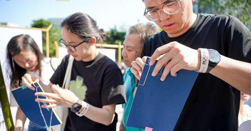 在纸艺体验区,非遗鱼灯和漆扇制作成为“人气王”项目,体验者纷纷排起长队。他们手里拿着刚做好的非遗鱼灯,等待着再制作一把独一无二的漆扇。此外,拈花书签、线装书的制作也吸引了大量人大学子和路过的体验者。