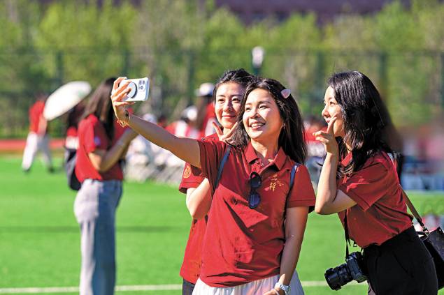 (2025年9月,人大通州校区全面正式投用,迎来首批研究生新生。图为新生在开学典礼上自拍。 香港文汇报北京传真)
