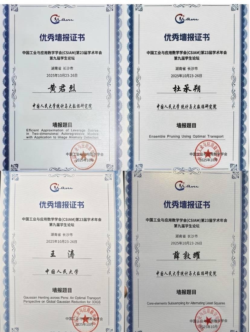 本届CSIAM学生论坛设有“墙报展示”交流环节,共有140余位学生参与此次展示,中国人民大学统计与大数据研究院共有8名博士生入选,他们分别是康欣来、黄君烈、朱珺、杜承朔、王涛、欧阳夏雪、薛敦耀、林俊一。现场展开了广泛的学术交流和讨论。通过组织专家评审,共评出21份“优秀墙报”,并于论坛颁发证书。黄君烈、杜承朔、王涛、薛敦耀4位同学获此殊荣,获奖数量位列参赛单位首位。