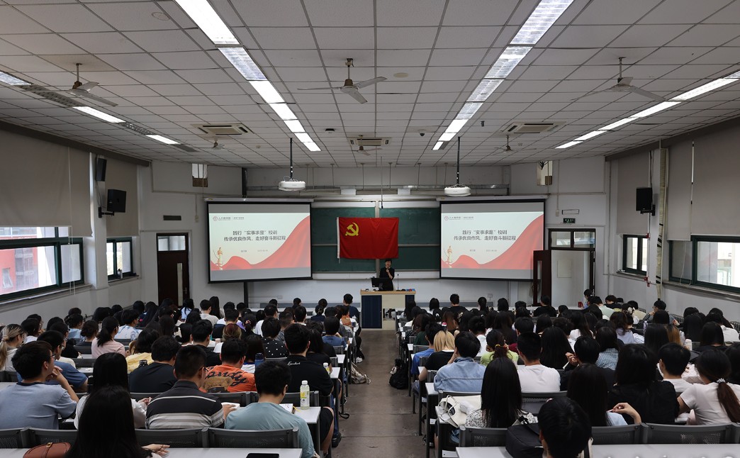 旋天颖从“实事求是”源起讲起,讲述了“实事求是”内涵的嬗变与升华,让大家对“实事求是”有了更深入的了解。她为大家解读了1937年陕北公学到北方大学、华北大学再到中国人民大学校训的发展变化,并以丰富的办学史料及商学院李占祥、阎达五等“大先生”的先进事迹,向大家阐述了一代代人大人坚持“实事求是”,脚踏实地,不怕牺牲,艰苦奋斗,不唯上、不唯书、只唯实,坚持理论联系实际,将马克思主义基本原理与中国实践结合,始终奋进在时代前列的优良作风。