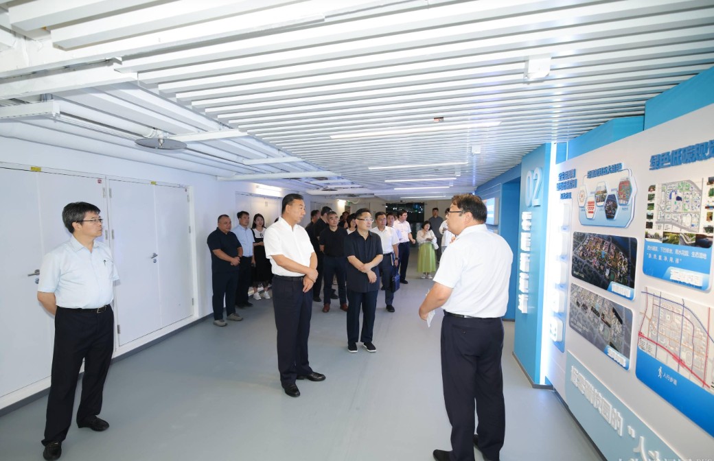 张东刚和林尚立首先来到绿色低碳校园展厅,参观通州校区“绿能筑梦、碳索未来”近零碳校园展,详细了解通州校区综合能源工程运行情况,询问供暖制冷系统以及各项节能数据。