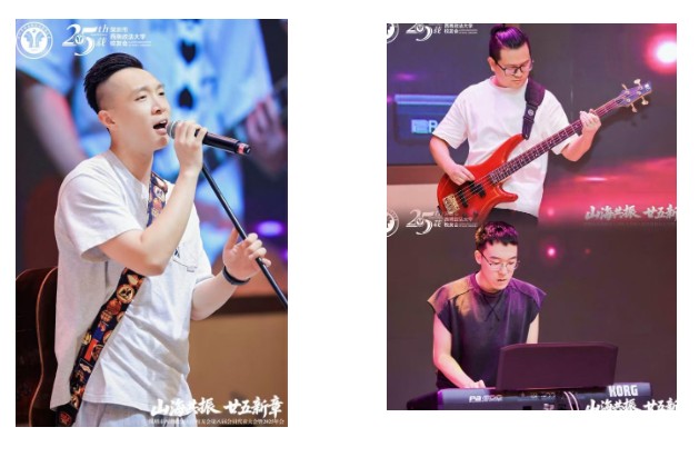 蔡晓丹校友带来的《默契》节奏轻快、情感真挚,将人与人之间心照不宣的情谊娓娓道来,呼应了校友间无需言说的深厚联结;朴程健和张巍校友演唱的《鲜花》旋律温暖、充满力量,借由歌声传递出对西政校友会 25 载耕耘的赞颂与对未来的美好期许。激昂的旋律搭配动感的节奏,乐队成员们全情投入的表演赢得了现场的掌声与喝彩。