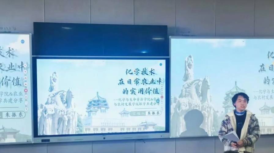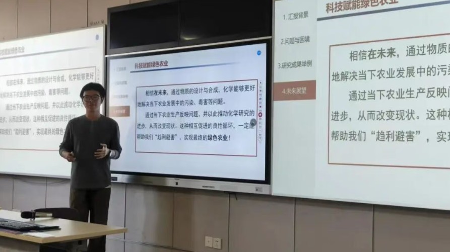 化学与生命资源学院朱振东同学从“化学+农业”的跨学科视角出发,详细阐述了化学技术在农业绿色转型中的具体应用。