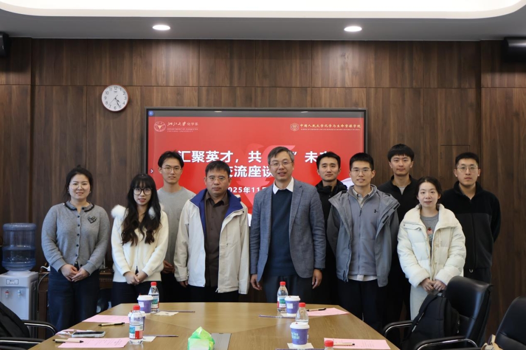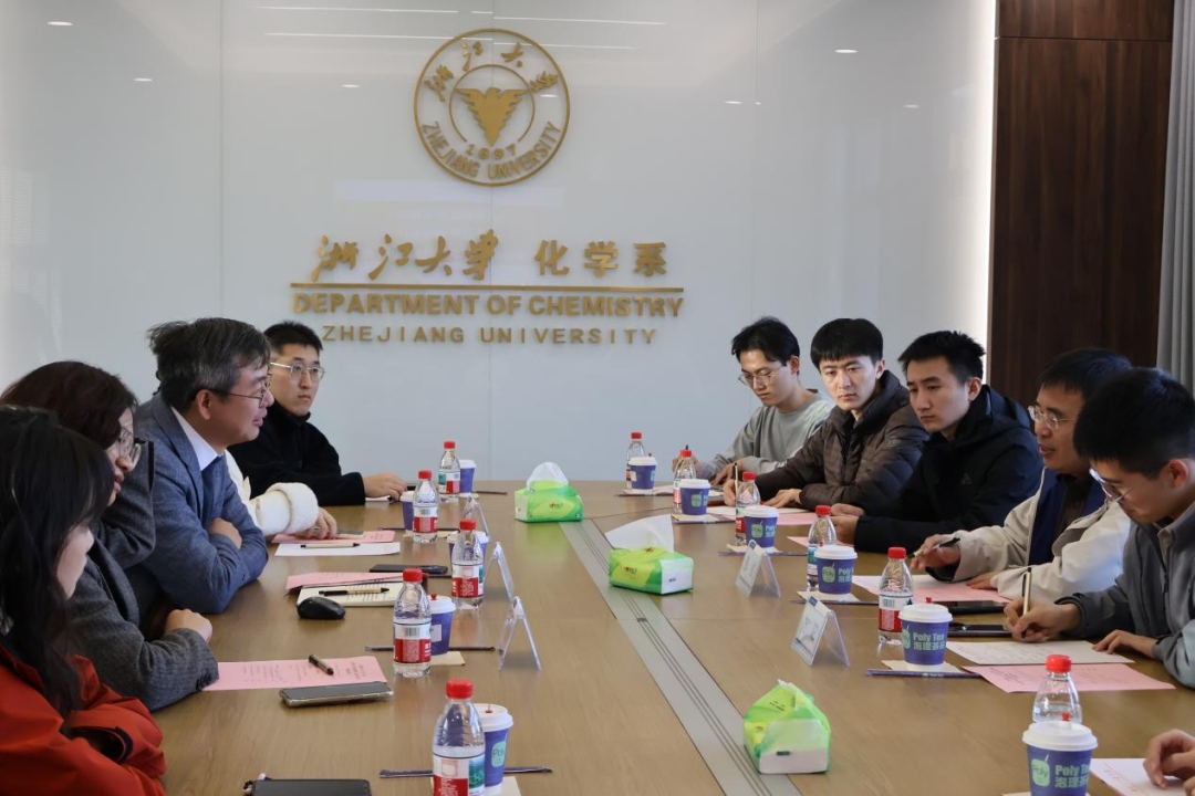 在座谈环节,浙江大学化学系副系主任王林军教授、学科与科研科科长黄珍珍老师、团委副书记徐璞儿老师等出席交流。黄珍珍老师热烈欢迎人大师生到访,并期待以此次交流为新起点,进一步拓展合作领域。王林军教授系统介绍了化学系的整体发展概况,重点围绕科研保障体系、“十四五”期间的科研布局与原创成果突破等方面展开阐述,指出化学系近年来在人才引育、平台建设、项目谋划与成果转化等方面的战略布局。王林军表示,化学系将继续瞄准世界科技前沿,强化基础研究与前瞻探索,力争实现更多引领性突破。随后,中国人民大学化学与生命资源学院副院长慕成教授从学院定位、发展特色、师资力量与学科建设水平等方面介绍了学院的总体情况。在自由交流环节,双方围绕学生党建工作、研究生培养、学术交流等共同关切的议题展开了深入而务实的讨论,现场气氛热烈融洽。