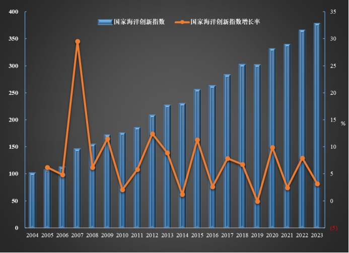 课题组对2004—2023年近20年国家海洋创新能力进行了定量测算,及发展趋势分析。结果显示,国家海洋创新指数年均增长率为7.23%,标志着我国海洋创新生态持续优化,核心创新能力实现稳步提升。