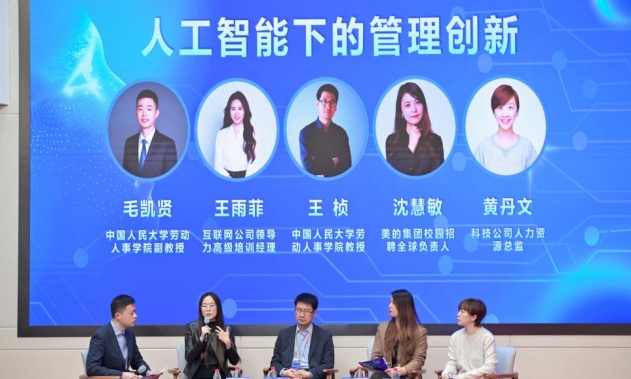 圆桌对话环节,中国人民大学劳动人事学院毛凯贤副教授与互联网公司领导力高级培训经理王雨菲、中国人民大学劳动人事学院王桢教授、美的集团校园招聘全球负责人沈慧敏、科技公司人力资源总监黄丹文围绕“人工智能下的管理创新”主题展开深入交流研讨。5位与会嘉宾从企业实践与学术研究双重视角,就AI时代人才招聘、培养、激励与留存等议题分享了各自洞见。王雨菲基于互联网企业实践,提出“AI原生人才”应具备思维架构师、批判者与智能体管理者三种角色能力;王桢教授指出,AI时代算法越发达,人的社会与情感能力与高阶认知成为更重要和稀缺资源,他提醒组织把节省下来的时间转化为“能力再投资”,从能力、动机和机会等方面创造条件,帮助员工实现可持续职业生涯;沈慧敏分享了美的“AI+HR”全链路实践,倡导“让AI成为高效助理,让HR转型为高情商伯乐”;黄丹文则提醒需警惕“AI能力假象”削弱独立思考,建议以夯实人的主体性原则及提供AI提效后带来的实质回报缓解员工被替代焦虑。嘉宾们一致认为AI时代最大的风险并非试错,而是观望;唯有先高频使用、再持续优化,才是实现“人机共生”的最短路径。