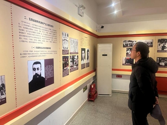 馆内陈列详细勾勒出五四运动以来马克思主义在天津的传播、中国共产党天津地方组织的创建与发展,以及党领导天津人民进行革命、建设、改革的壮阔画卷。在“五四运动和天津共产主义者的成长”专题展区前,几位同志结合展出的历史文献与图片,展开了热烈讨论,回顾了以周恩来、邓颖超等为代表的天津先进青年在时代洪流中探求真理、投身革命的感人故事,深刻感悟到早期共产主义者坚定的理想信念和炽热的家国情怀。