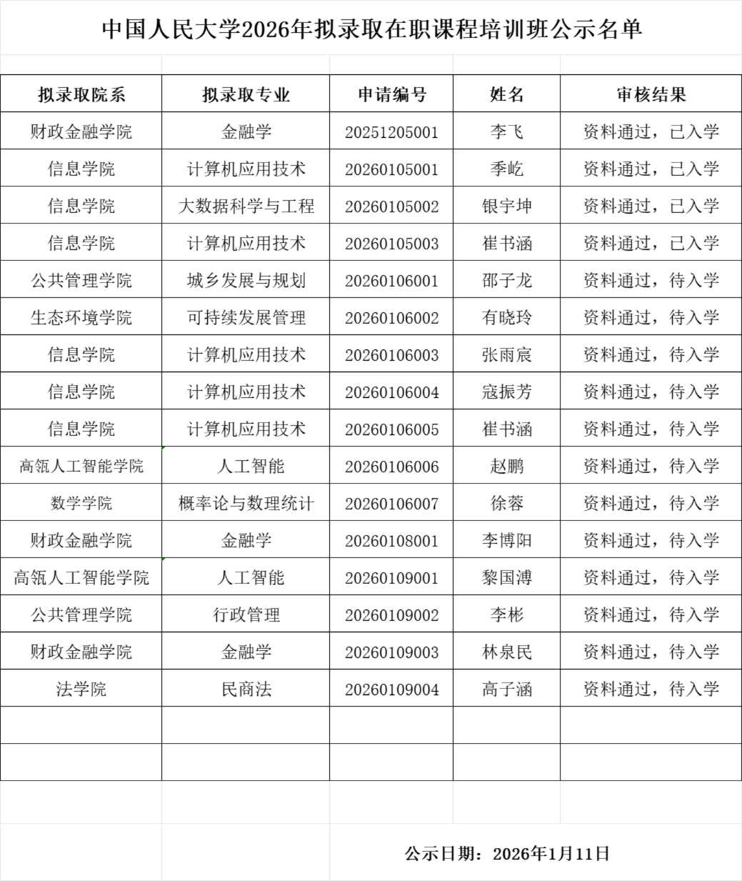 中国人民大学在职课程培训班2026年春季班拟录取名单于1月10日进行第一批公示,该名单经中国人民大学深圳校友会(下称“深圳校友会”)严格审核后对外发布,宣告新一轮专业化人才培育项目的全面启幕。经层层筛选,共有16名申请者凭借过硬的综合素养通过材料审核,成功斩获本次宝贵的学习资格。