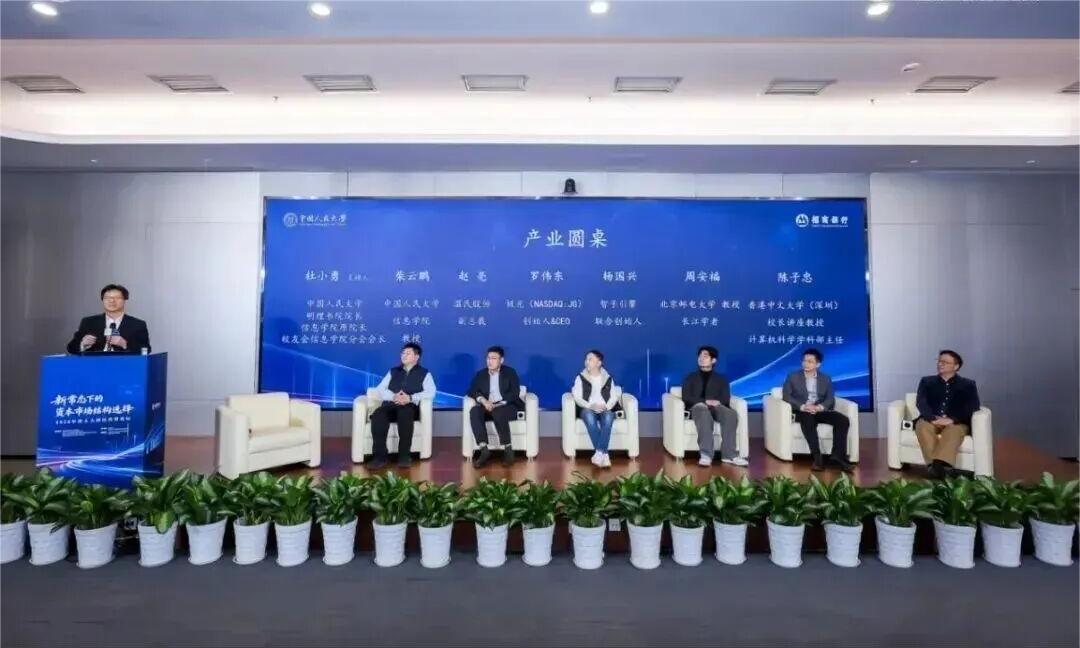 产业圆桌由中国人民大学明理书院院长、信息学院原院长、中国人民大学校友会信息学院分会会长杜小勇主持,中国人民大学信息学院教授柴云鹏,温氏股份副总裁赵亮,极光创始人罗伟东,智子引擎联合创始人杨国兴,北京邮电大学教授长江学者周安福,香港中文大学(深圳)校长讲座教授、计算机科学学科部主任陈子忠就当前热点话题OPC(one person company)开展圆桌探讨。