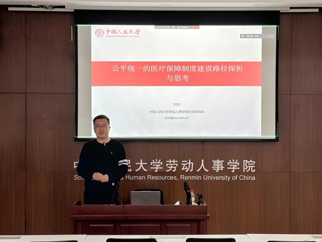 2026年1月7日晚上,中国人民大学劳动人事学院人力资源与领导力开发中心主办的“人大劳人·前沿洞察”系列讲座第四讲成功举行。中国人民大学劳动人事学院刘凯教授带来了一场主题为《公平统一的医疗保障制度建设路径探析与思考》的专题讲座。讲座深入剖析了当前我国医保制度的发展现状、区域差异成因及改革方向,为推动医保制度向更公平、更统一、更可持续的方向迈进提供了重要思路。